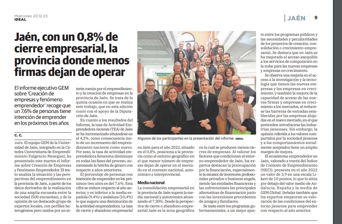Presentado el Informe GEM, que indica que se duplica el porcentaje de población jiennense que percibe oportunidades para iniciar negocios.